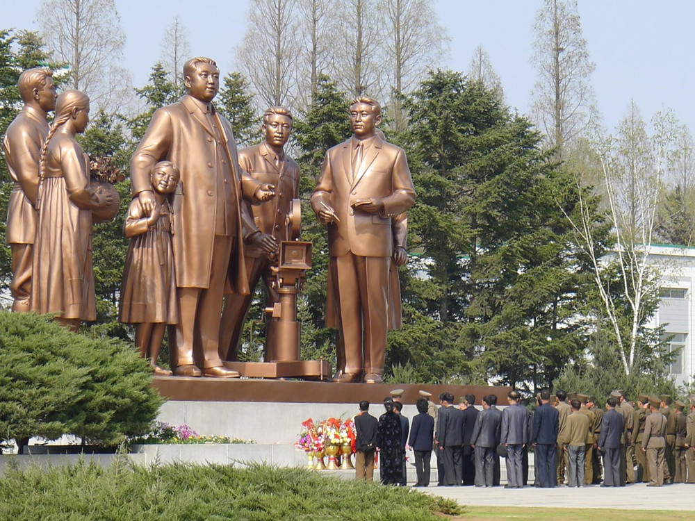 朝鲜著名电影《卖花姑娘》1972年上映,由于该电影太过知名,影视城内雕刻了金日成与剧组人员站在一起的青铜雕像。(网页截图)