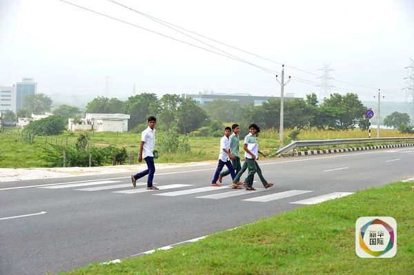 2015年10月5日,村里学生穿过高速公路去上学。图片来源:新华/法新