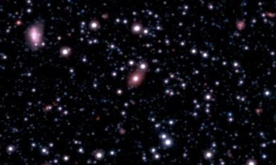 新发现的星系SAGE0536AGN(图像中央粉色椭圆星系)被发现其中心存在一个超大质量黑洞,并且其质量远超天文学家们的预期。这个黑洞的成长速度似乎远远超出了它的宿主星系