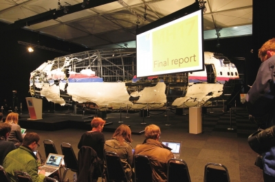 13日下午在海牙举行的新闻发布会上,荷兰调查人员展示了MH17航班前半截残骸的重组。调查人员给在坠机现场寻获的每块残骸编号、拍照、扫描、分组,在荷兰南部的希尔泽-赖恩空军基地部分还原了客机机鼻、驾驶舱和商务舱。当扭曲且布满弹孔的客机残骸出现在眼前时,现场媒体记者一片沉寂。