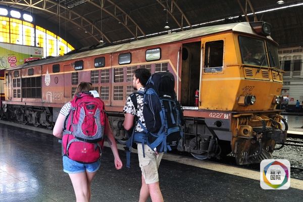 曼谷市火车站,两名游客从老旧的列车旁走过。(新华社发)