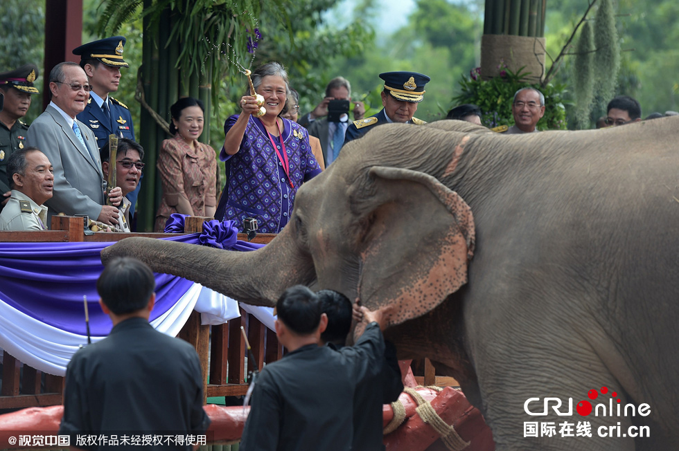 当地时间2015年10月15日,泰国华富里府,泰国诗琳通公主向大象泼洒圣水。泰国诗琳通公主庆祝60岁生日,放生了6头大象,461只其他的动物。图片来源:PORNCHAI KITTIWONGSAKUL/CFP