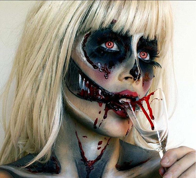 这名金发女郎不惜把脸和身体当做画布,将自己变身为恐怖玩偶、吸血骷髅以及断头尸等超恐怖角色。她在自己的Instagram账号上分享了这些作品,很快就为她吸引了5000多名追随者。