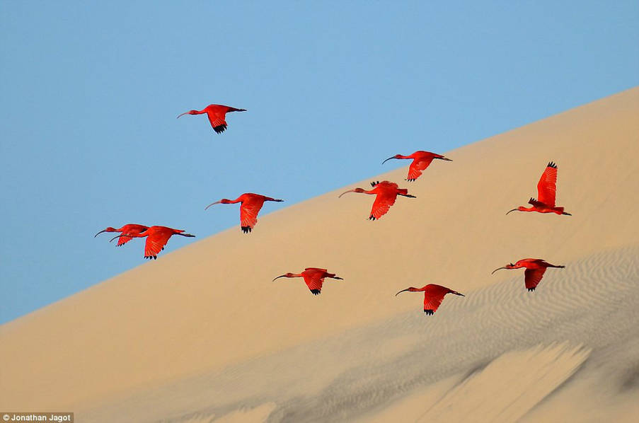 Jonathan Jagot获得 15-17 年龄组最佳摄影奖,作品抓拍到了一群美洲红鹮掠过沙丘时的瞬间。该照片摄于巴西东北部的Len óis岛。