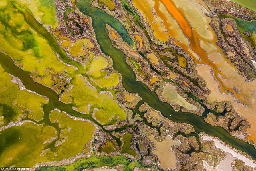 天空之眼:“水藻的艺术”由西班牙摄影师Pere Soler所拍摄。照片展示了海岸边潮间带湿地被大量绿色海藻和五颜六色的花朵点缀成色彩斑斓的图形,同时也变成了一片大型鸟类栖息地。该照片摄于安达卢西亚海岸边的Bahía de Cádiz自然公园。