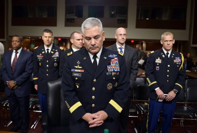 10月6日,在美国华盛顿国会山,北约驻阿富汗部队最高指挥官约翰·坎贝尔(中)出席参议院军事委员会听证会。坎贝尔6日承认,美军在3日轰炸阿富汗北部城市昆都士的军事行动中误炸了一所医院。国际医疗救援组织“无国界医生”位于昆都士的一所创伤中心3日遭到轰炸,共有12名员工和包括3名儿童在内的10名病人死亡。新华社记者 殷博古 摄