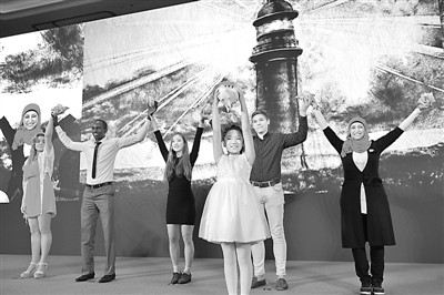 图为在国际海岛旅游大会开幕式上,来自五大洲的代表将各自国家海岛的沙子聚集在一个海螺中,携手共祝海岛旅游发展的美好明天。李中一摄