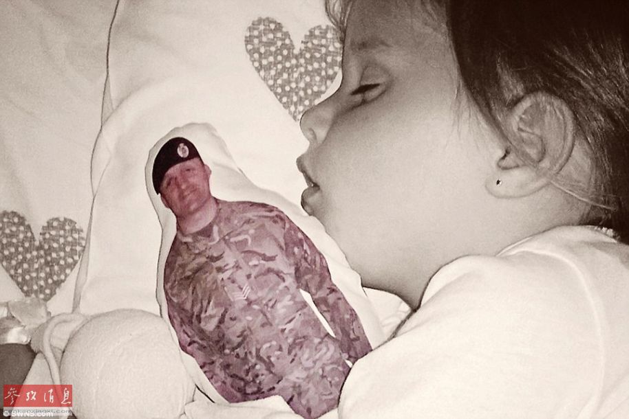 4岁的Teleri Mai Rees抱着印有父亲头像的抱枕睡着了。