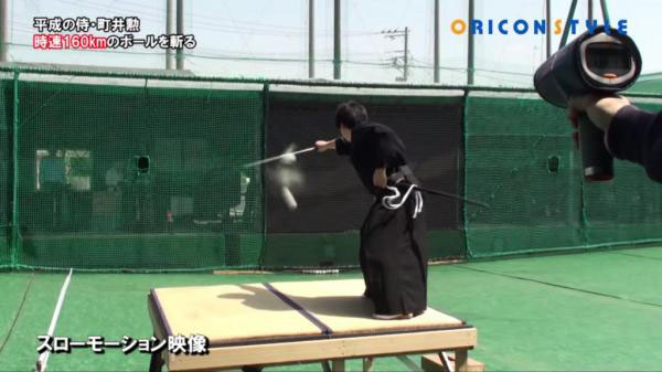视频中,町井勋握剑站在距离自动投球机30英尺(约9米)处,将以每小时160千米的速度飞驰而来的快速球削成两半。
