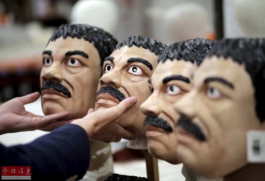2015年10月14日,墨西哥库埃纳瓦卡, Grupo Rev公司打造的乔奎恩·古兹曼形象的万圣节面具。想要在万圣节期间抓获越狱潜逃的大毒枭古兹曼十分困难,但是Grupo Rev公司打造的搭配囚服的古兹曼形象的面具,已经出口全球30多个国家,将成为热销的物品。