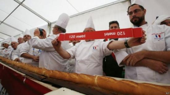 外媒称,在意大利米兰世界博览会上,来自法国和意大利的面包师合力烘烤出全球最长的法式长棍面包,总长120米。