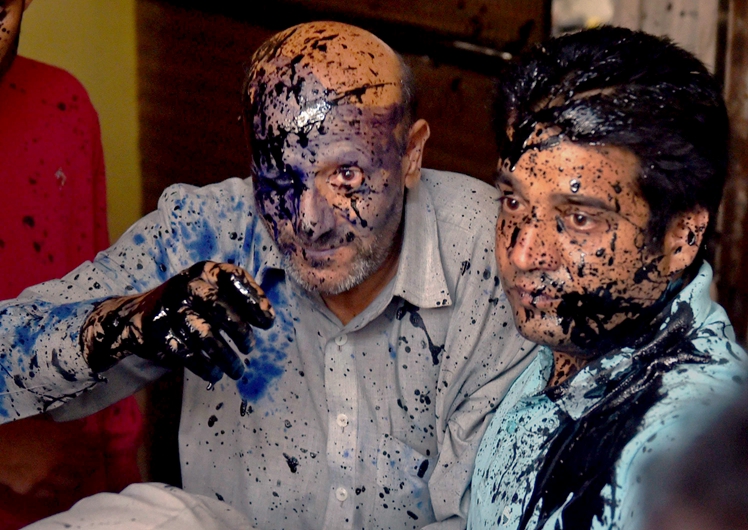 据美联社报道,当地时间2015年10月19日,印度新德里,克什米尔议员Sheikh Abdul Rashid因支持吃牛肉遭活动家愤怒泼墨。(图片来源:美联社)