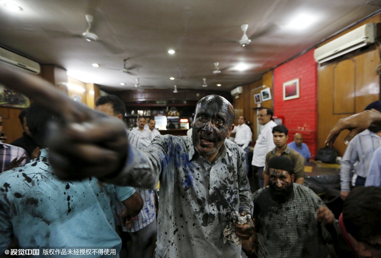 当地时间2015年10月19日,印度新德里,克什米尔议员Sheikh Abdul Rashid因支持吃牛肉遭活动家愤怒泼墨。(图片来源:CFP视觉中国)