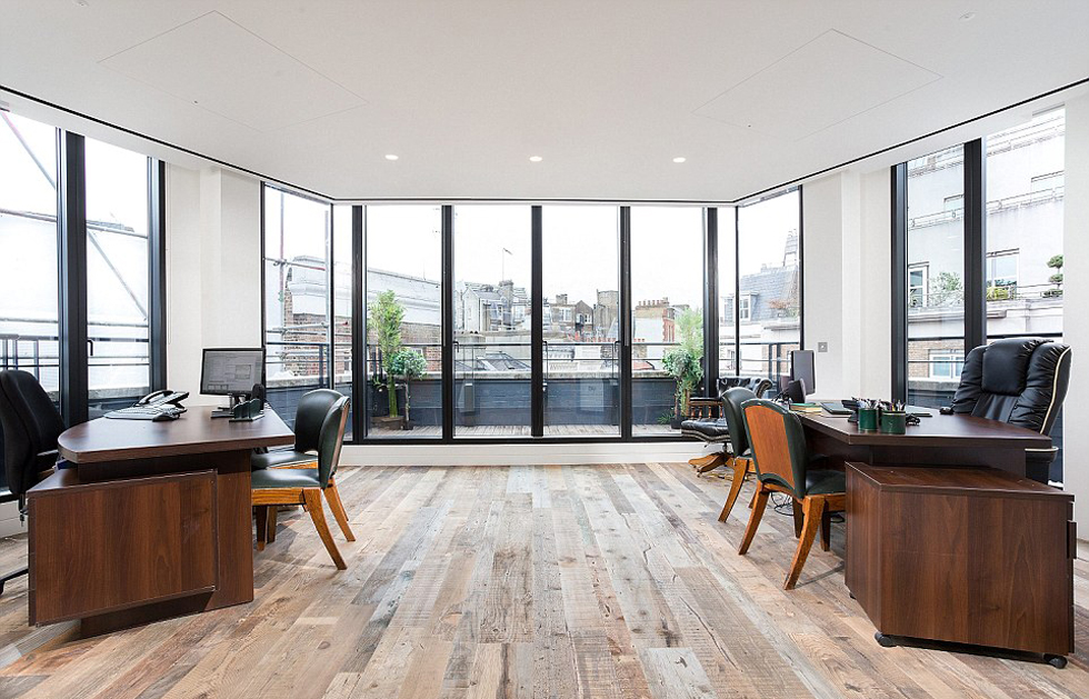 Enstar Capital的写字楼是目前为止伦敦西区最贵的改造工程。主管办公室带有私人阳台,配备躺椅和餐桌,可以举行户外会议。(网页截图)