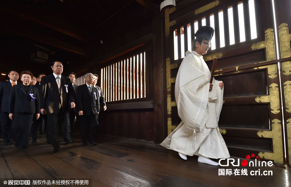 当地时间2015年10月20日,日本东京,日本“大家一起来参拜靖国神社国会议员会”的成员上午参拜了靖国神社。自民党、民主党、维新党、次世代党等党派议员总计约70人参加。图片来源:Reuters/视觉中国