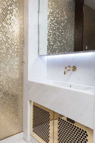 该写字楼总面积达6000平方英尺,洗手间是仿照阿玛尼酒店(Armani hotel)豪华风格打造,天花和地板均以镀金马赛克图案装饰。
