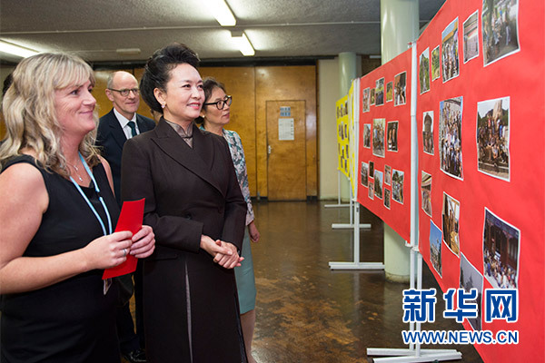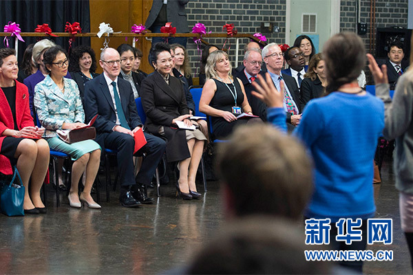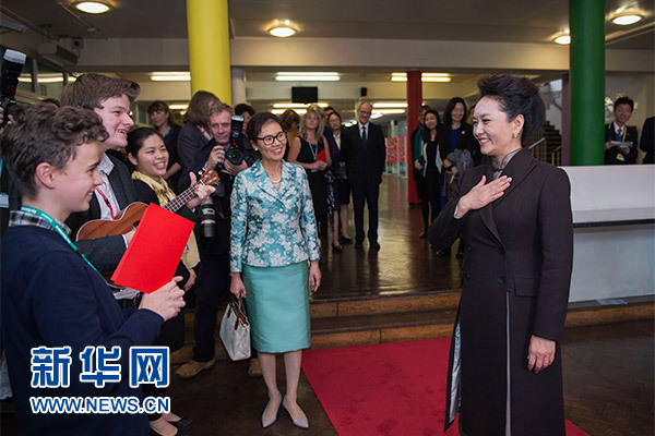 在英国教育部国务大臣吉布、学校校长等陪同下,彭丽媛观看学生们用中文进行的才艺表演,参观学校成果展,观摩中文课,与女学生们互动交流,并向学校赠送中国文化及汉语学习类图书及音像制品。