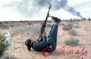 利比亚战争期间,武装分子用轻武器射击飞机。