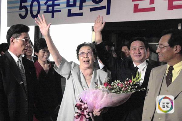 2000年8月15日, 按照韩国和朝鲜红十字会2000年6月底达成的协议,首次韩国和朝鲜的各为100人的离散家属访问团于8月15日至18日开始访问平壤和汉城,与他们分别50多年的亲人重逢。 图为朝鲜访问团成员抵达汉城机场时,向前来迎接的人们挥手致意。