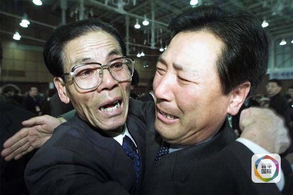 2000年12月2日和2001年2月26日,韩国和朝鲜的第2次和第3次离散家属访问团成员分别访问汉城和平壤,与他们离别了50多年的亲人重逢。图为第3批一位来自朝鲜的69岁男子(左)在汉城与分别50多年的弟弟相见时激动地拥抱在一起。