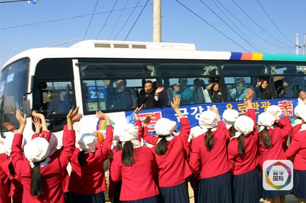 2002年4月20日和9月16日,韩国和朝鲜的第4次和第5次离散家属访问团成员在朝鲜的金刚山旅馆团聚。 2003年2月14日,韩朝间金刚山陆路旅游路线开通。根据韩朝双方已达成协议,参加2月20日至25日在金刚山举行的第6次离散家属见面活动的人员也将利用这条临时公路前往金刚山。图为在韩国东海岸江原道高城郡,一队韩国儿童欢送首批韩国游客乘大客车由陆路前往金刚山旅游。