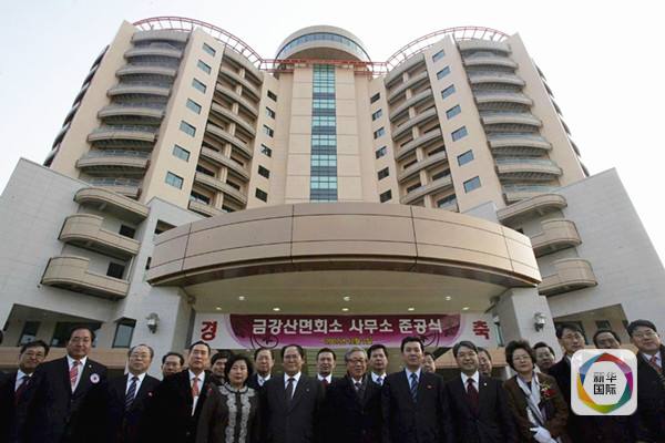 2007年12月7日,韩国统一部发表新闻公报说,韩国和朝鲜合作建设的金刚山离散家属会面所南北事务所当日举行竣工仪式,300多名韩朝各界代表参加了仪式。图为来自朝韩双方的代表在金刚山离散家属会面所前合影。