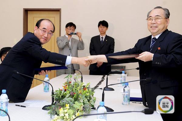 2009年8月28日,韩国和朝鲜红十字会代表在朝鲜金刚山地区就中秋节两国离散家属会面问题达成协议。朝鲜红十字会中央委员会副委员长崔圣益(前右)与韩国红十字会事务总长金荣喆(前左)在达成协议后握手。
