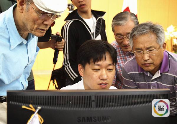 2013年8月24日,在位于首尔的韩国红十字会总部,几位老者在查看他们是否能参加团聚活动。