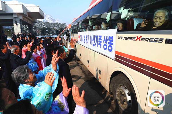 2014年2月22日,在朝鲜金刚山景区,几名朝鲜人挥手向坐在大巴内的韩国亲属告别。