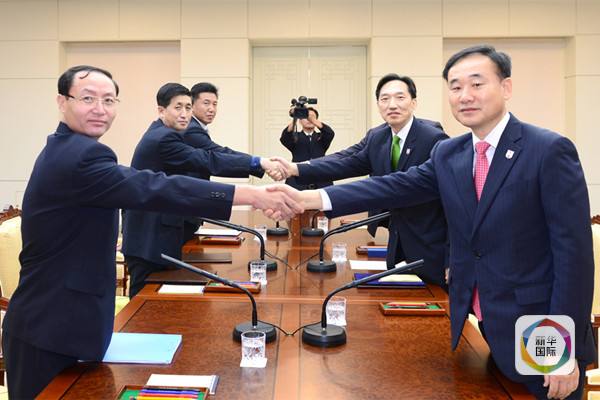 2015年9月8日,韩朝红十字会工作会议在韩朝边界板门店韩方一侧的“和平之家”达成协议,商定于10月20至26日在金刚山举行离散家属团聚活动,活动参与人数共200人。 图为朝鲜代表团(左)与韩国代表团在会议现场握手合影。