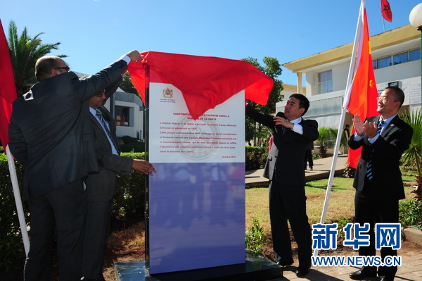 中方代表、上海卫计委副主任赵勇(右二)和摩方代表、卡萨布兰卡-塞达特大区卫生厅长胡塞·卢瓦尔迪(左二)共同为纪念碑揭幕。新华社记者蔡施浩摄