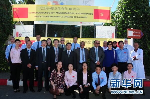 中摩双方代表团、该院部分中国医疗队员和部分摩洛哥医护人员合影留念。新华社记者蔡施浩摄
