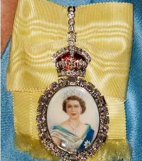 女王的徽章由黄色缎带、女王年轻时的画像和一顶用红色珐琅装饰的都铎皇冠组成。