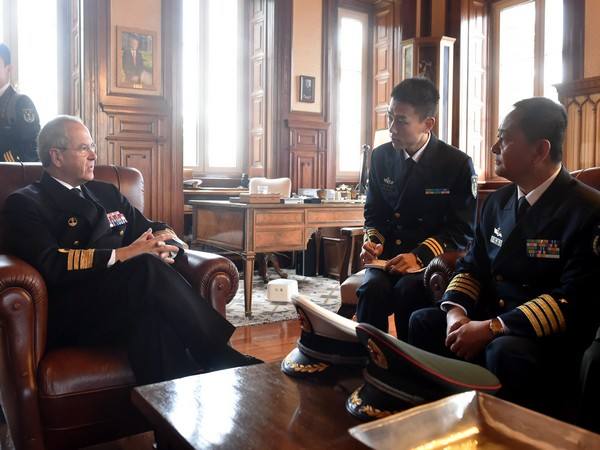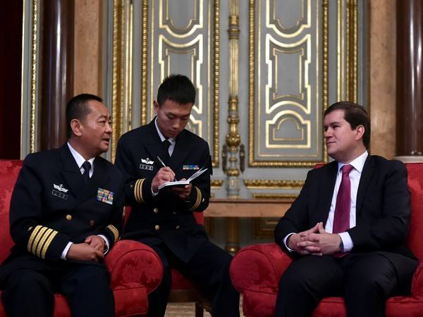 10月19日,在葡萄牙首都里斯本,中国海军152舰艇编队指挥员王建勋(右)在葡萄牙海军司令部拜会葡海军作战司令佩雷拉·达·库尼亚(左)。