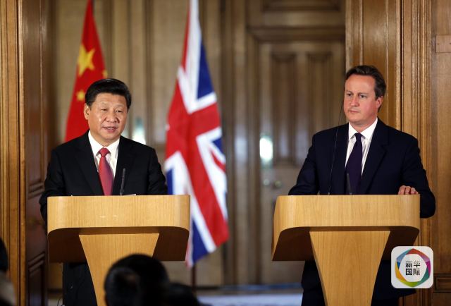 10月21日,国家主席习近平在伦敦唐宁街首相府同英国首相卡梅伦举行会谈。这是会谈结束后,习近平和卡梅伦共同会见记者。 新华社记者鞠鹏摄