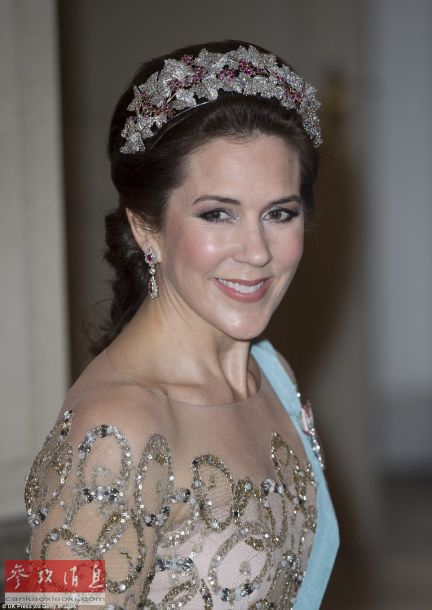 丹麦皇室收藏的皇冠都很端庄的,2015年4月哥本哈根,丹麦王储妃玛丽戴着镶有红宝石的头饰。