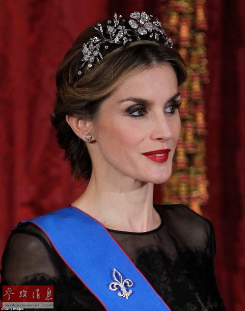 2014年西班牙王后莱蒂齐亚戴着花式头饰,头饰中间的花瓣可以拆下来当做胸针佩戴。