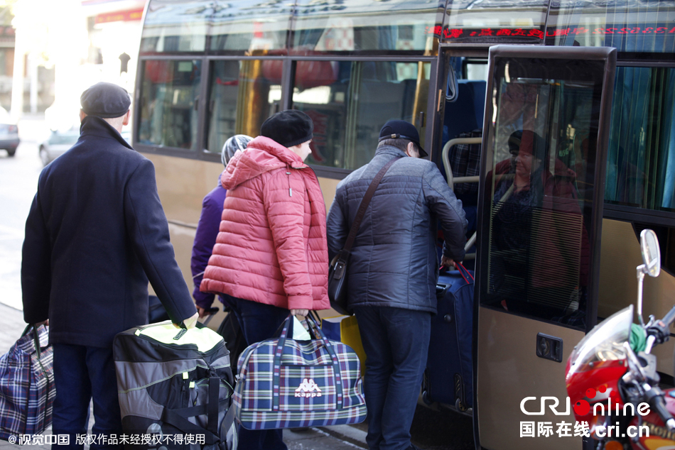 2015年10月24日,黑龙江黑河,俄罗斯大妈组团乘坐两辆中巴赴黑河扫货购物。 俄罗斯游客拎着或拖拉着一大包或几大包购买的商品准备乘车离开。图片来源:cfp