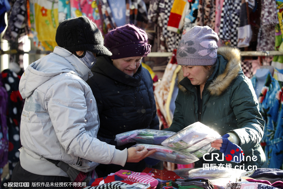 2015年10月24日,黑龙江黑河,俄罗斯大妈组团乘坐两辆中巴赴黑河扫货购物。两位俄罗斯大妈正在黑河市早市上扫货购物。