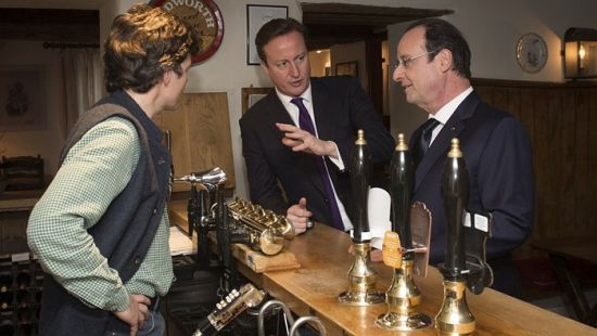 卡梅伦与法国总统奥朗德在酒吧“闲聊”。(资料图)