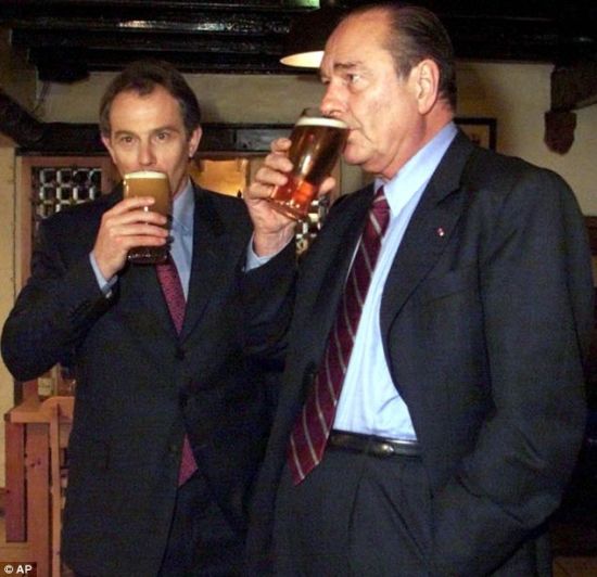 布莱尔与时任法国总统希拉克畅饮啤酒。(资料图)