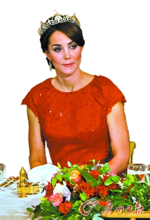 国宴上,凯特一袭“中国红”礼服裙不仅赏心悦目,还表达出对宾客国的致意。此外,她还戴上特别向英女王借用的英国王室珍藏的莲花钻石冠冕。