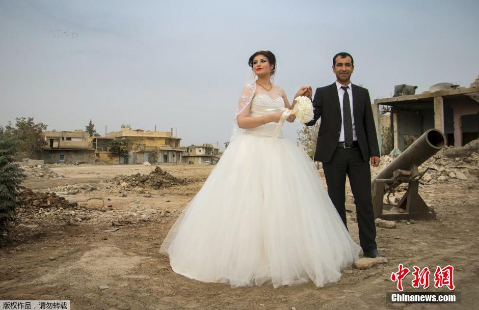 当地时间10月23日,叙利亚科巴尼一对新人正在举行婚礼。婚礼现场布置的十分简单,夫妻二人沿途走过的街头废墟和大炮随处可见。新郎新娘在户外举办了酒席,亲朋好友相聚。这对科巴尼库尔德夫妻是自从科巴尼从“伊斯兰国”手中夺回后第一对举行婚礼的夫妻。
