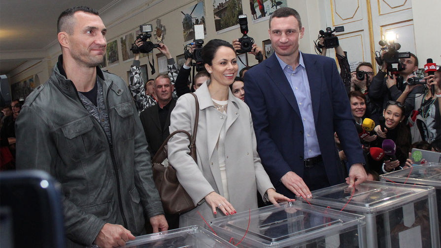 乌著名拳击运动员弗拉基米尔·克利奇科(左)、基辅市长维塔里·克利奇科(右)和妻子纳塔莉娅在基辅一投票点参加投票。(网页截图)