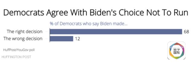 新华网北京10月26日电 据赫芬顿邮报与舆观调查网(YouGov)联合发起的一项最新民意调查显示,在美国副总统拜登21日明确表示将不参加2016总统竞选后,68%民主党人认为他这么做实乃“一个正确的决定”,而认为弃选是“错误决定”的人数仅占12%。