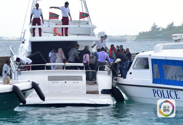 9月28日,马累官方码头,一名伤者被救援人员从总统快艇转移到警方快艇上。(图片来源:新华/法新)
