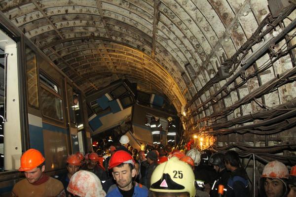2014年7月15日,莫斯科地铁隧道内,脱轨后的车厢扭曲在一起。