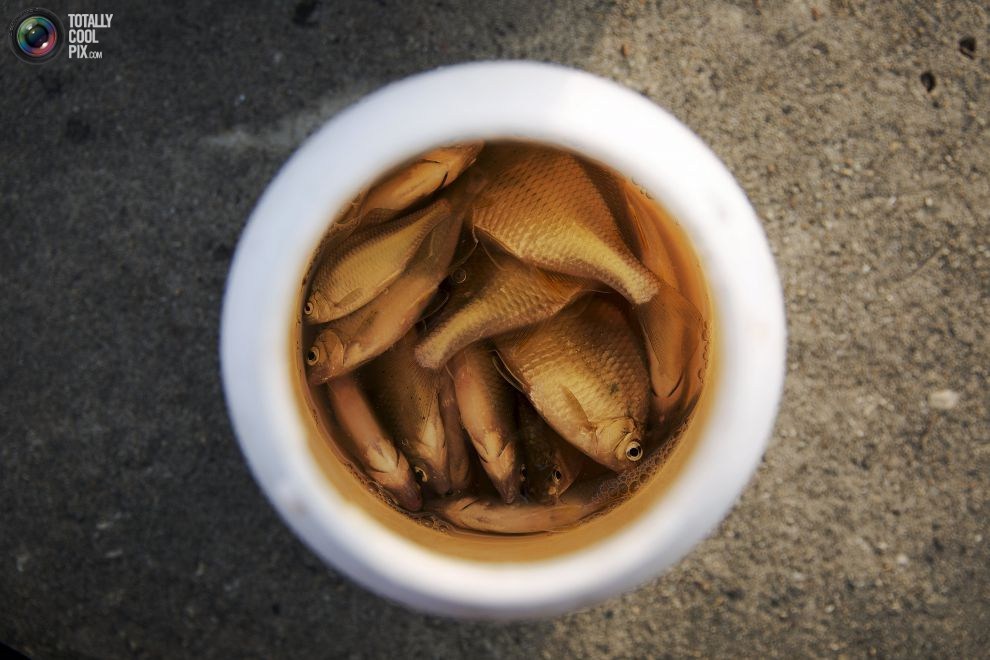 大同江边钓鱼男子瓮中的鱼。