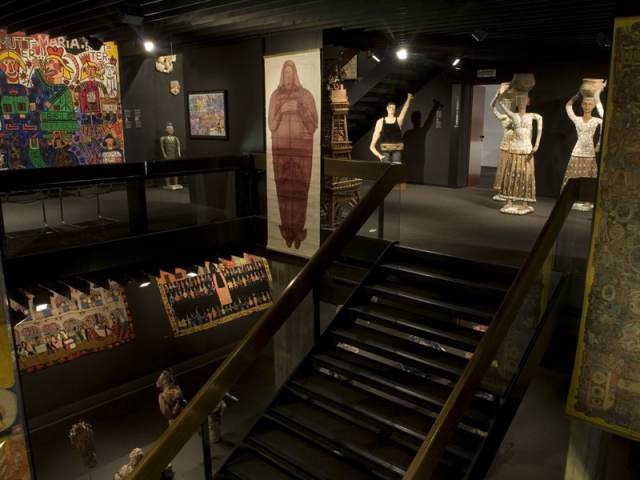 原生艺术收藏馆内最醒目的是阿洛伊斯·科尔巴的巨幅画作,这幅长卷从馆内三四层楼高的顶部垂挂下来,画面的主色被大片的明黄、宝蓝、橙红占据,而一对对相拥恋人的主题则在画面中反复出现。