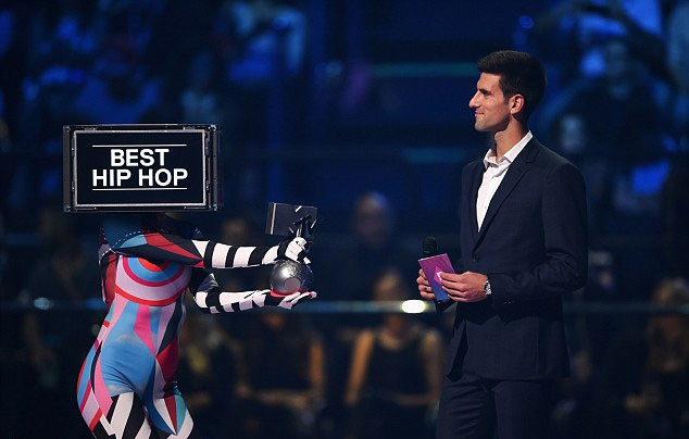 身着西装的网球选手诺瓦克·德约科维奇为她颁奖时,妮琪·米娜通过视频发表了获奖感言